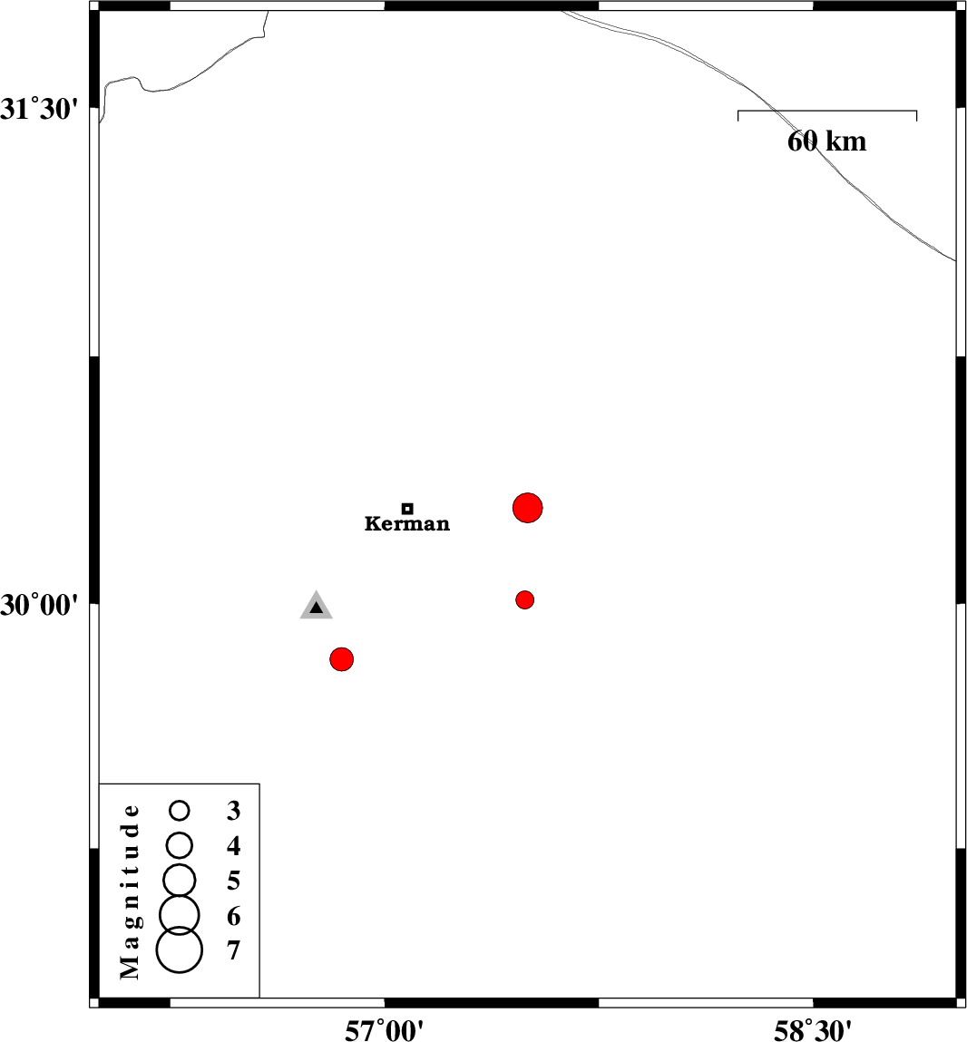 | 2009/04/24 | 08:56:35.3 | 13:26:35.3 | 30.01 | 57.49 | 8 | ML:2.8 | 50 km South-East of Kerman, Kerman Province |