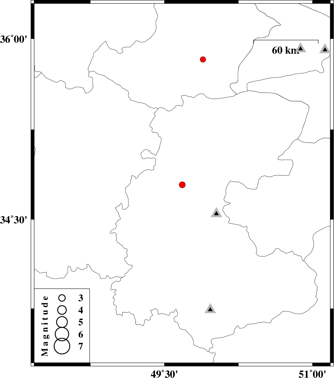 | 2009/05/15 | 03:08:11.6 | 07:38:11.6 | 34.79 | 49.68 | 46 | ML:2.8 | 33 km West of Tafresh, Markazi Province | ||