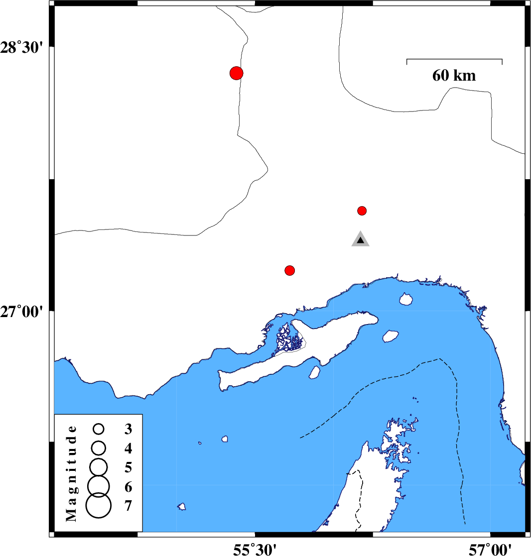 | 2009/05/13 | 23:39:51.4 | 04:09:51.4 | 28.35 | 55.38 | 14 | ML:3.8 | 50 km West of Hajiabad, Hormozgan Province | ||
