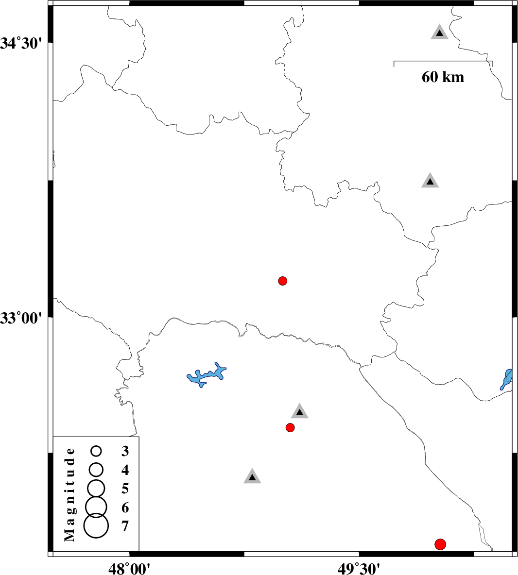 | 2009/05/18 | 15:09:31.7 | 19:39:31.7 | 33.2 | 49 | 15 | ML:2.6 | 32 km South of Dorud, Lorestan Province | ||