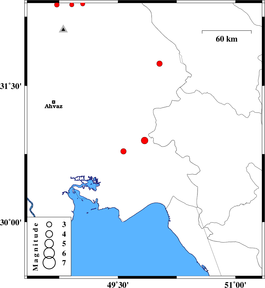 | 2009/04/26 | 05:43:59.0 | 10:13:59.0 | 30.78 | 49.57 | 36 | ML:3.2 | 13 km West of Omidiyeh, Khoozestan Province |
