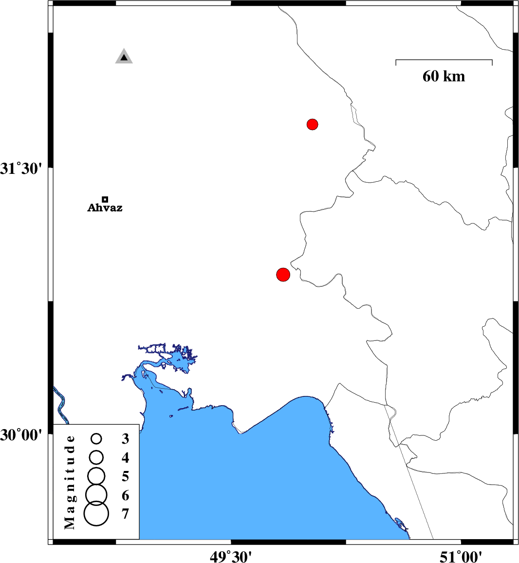 | 2009/05/23 | 12:22:45.6 | 16:52:45.6 | 30.9 | 49.84 | 39 | ML:4 | 19 km North-East of Omidiyeh, Khoozestan Province | ||