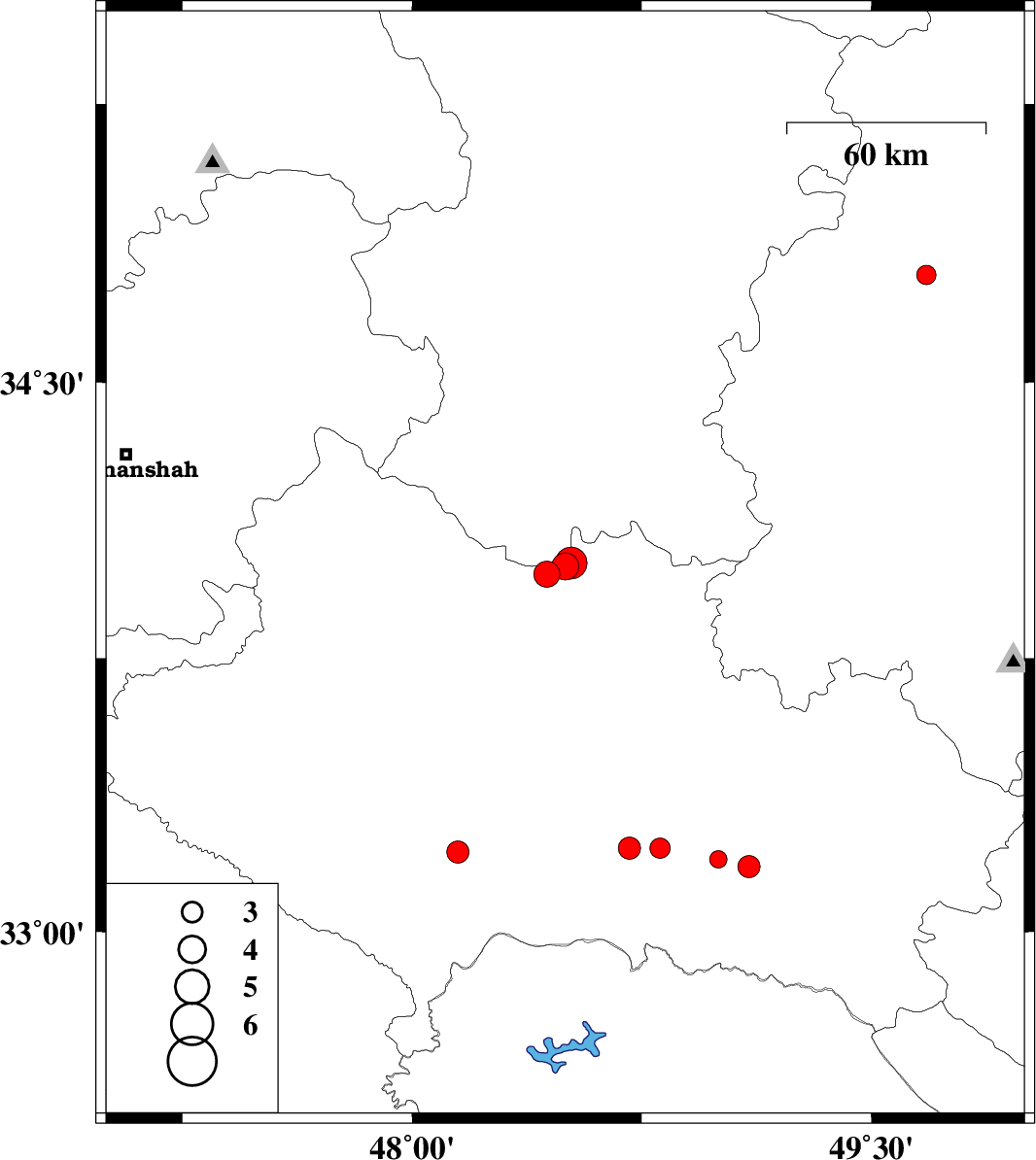 | 2009/05/18 | 15:09:31.7 | 19:39:31.7 | 33.2 | 49 | 15 | ML:2.6 | 32 km South of Dorud, Lorestan Province | ||