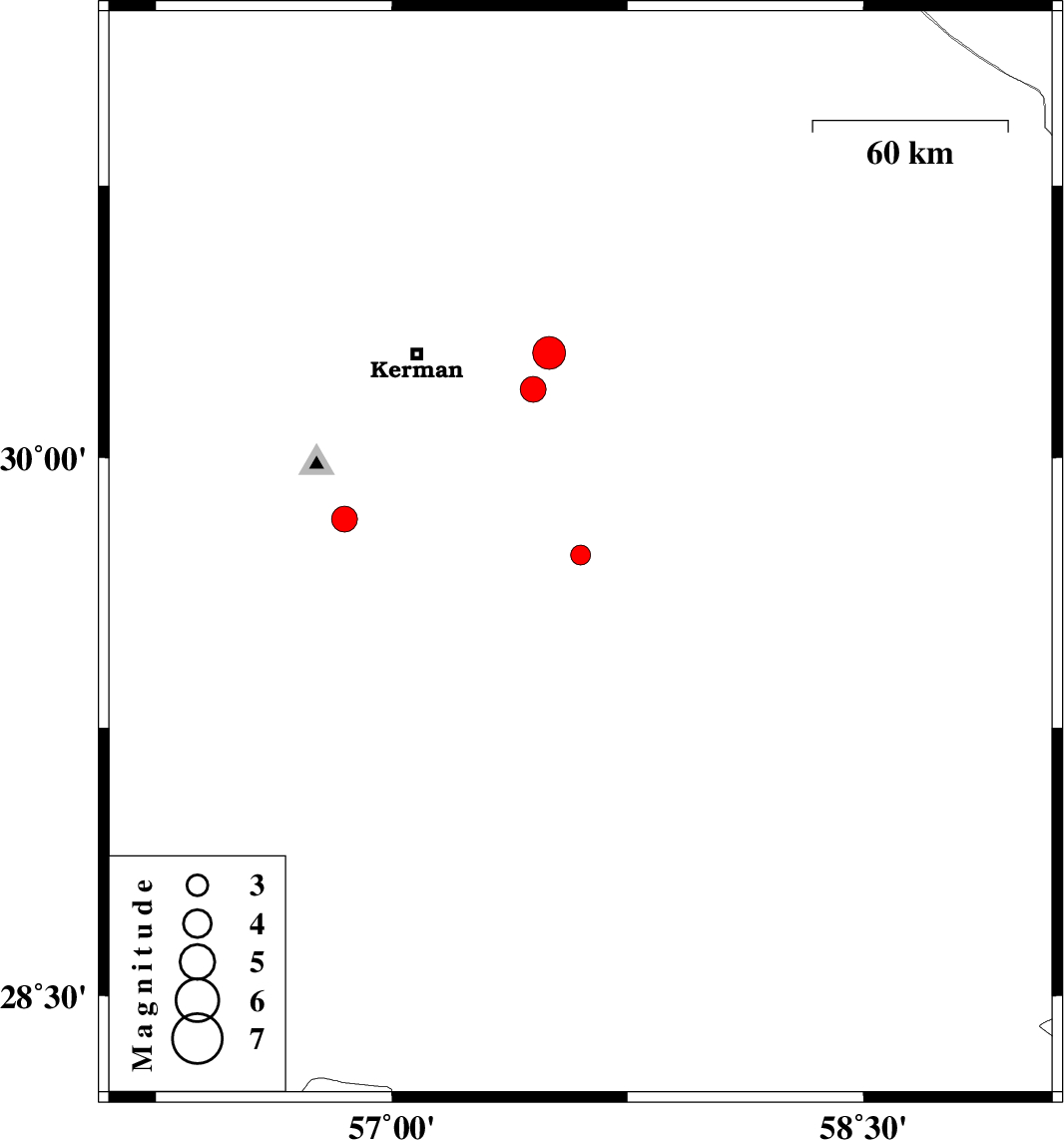 | 2009/05/29 | 03:43:05.7 | 08:13:05.7 | 29.73 | 57.6 | 14 | ML:2.8 | 79 km South-East of Kerman, Kerman Province | ||