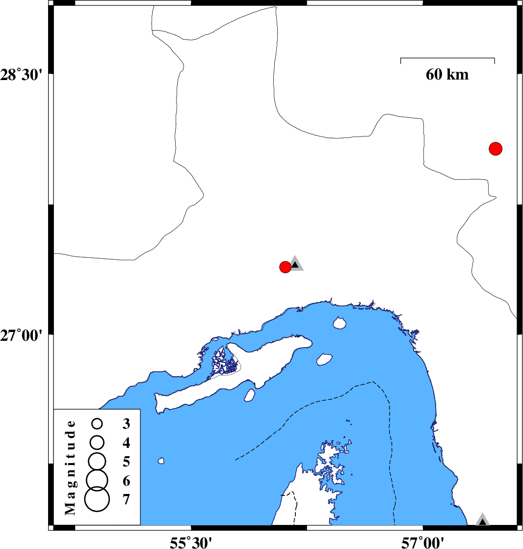 | 2009/06/01 | 04:50:10.7 | 09:20:10.7 | 27.39 | 56.11 | 6 | ML:3.4 | 29 km North-West of Bandar-e abbas, Hormozgan Province | ||