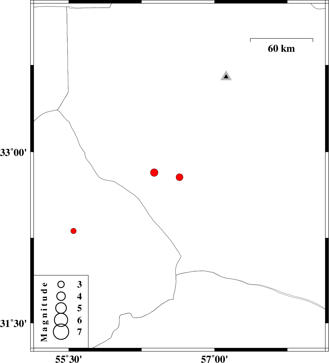 | 2009/06/03 | 08:59:50.5 | 13:29:50.5 | 32.31 | 55.55 | 45 | ML:2.5 | 79 km North-East of Bafq, Yazd Province |