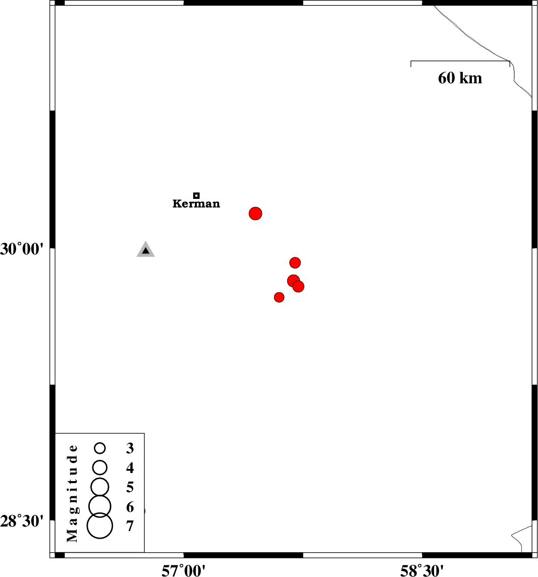 | 2009/05/29 | 03:43:05.7 | 08:13:05.7 | 29.73 | 57.6 | 14 | ML:2.8 | 79 km South-East of Kerman, Kerman Province | ||