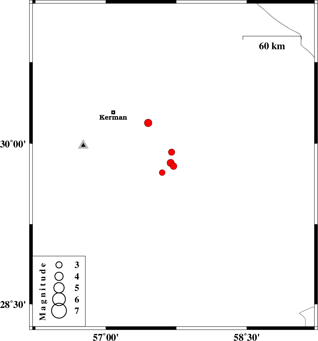 | 2009/05/29 | 03:43:05.7 | 08:13:05.7 | 29.73 | 57.6 | 14 | ML:2.8 | 79 km South-East of Kerman, Kerman Province | ||