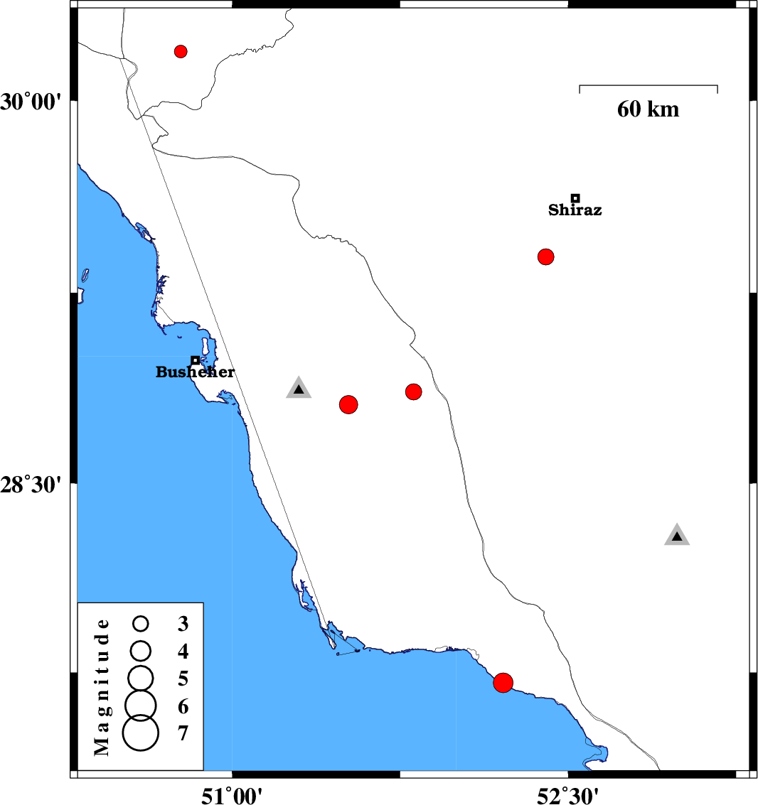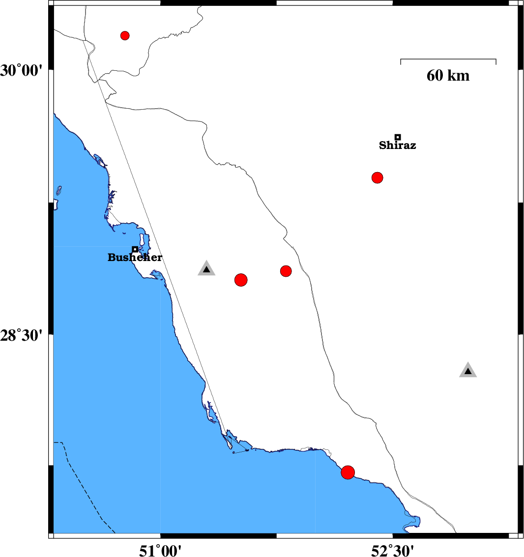 | 2009/05/17 | 01:05:11.2 | 05:35:11.2 | 27.71 | 52.21 | 17 | ML:3.9 | 17 km South-West of Jam, Bushehr Province |