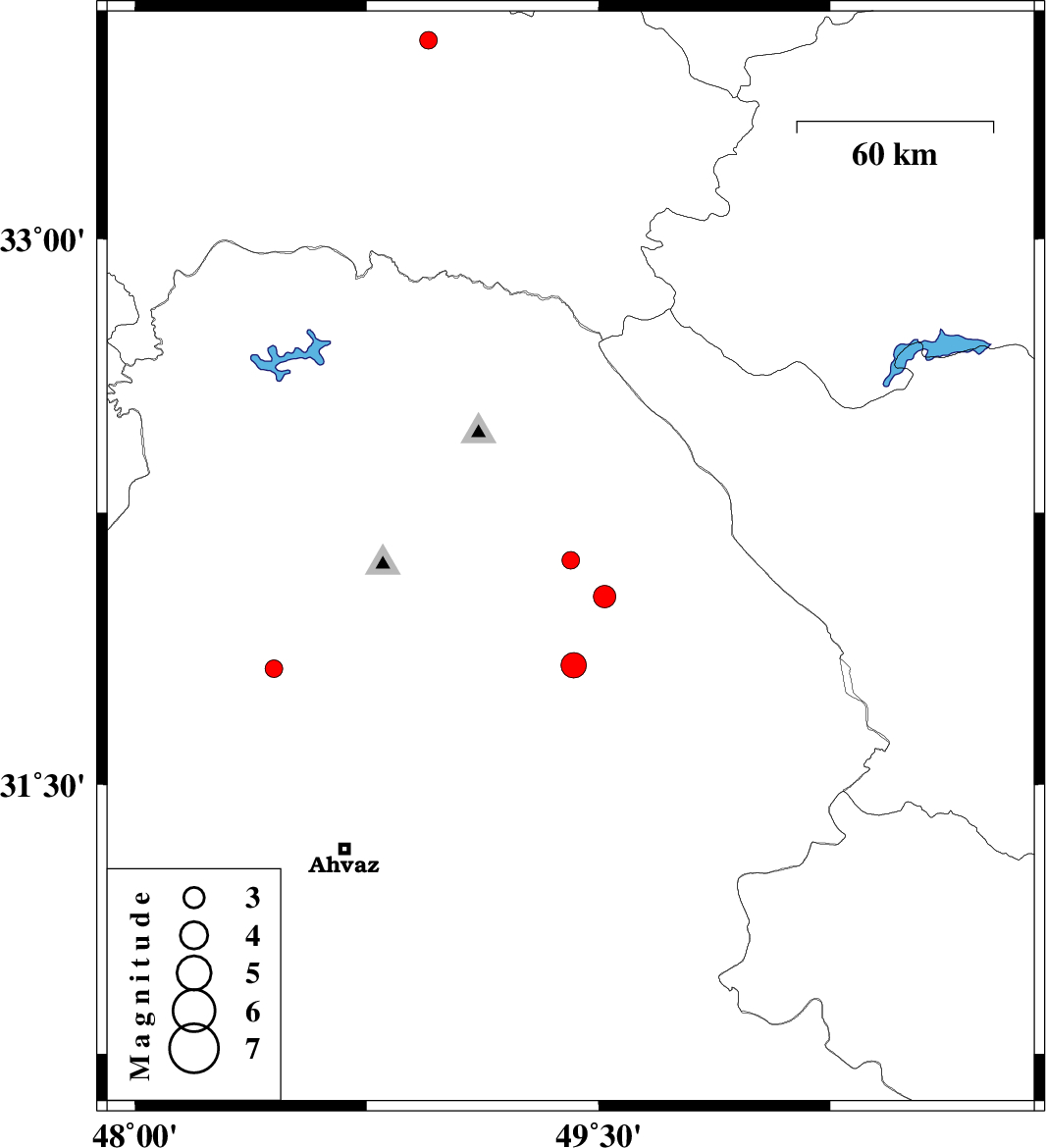 | 2009/06/12 | 04:01:27.8 | 08:31:27.8 | 31.83 | 49.42 | 16 | ML:3.7 | 15 km South-East of Masjed Soleyman, Khoozestan Province | ||