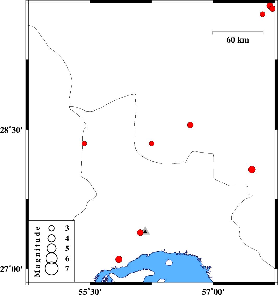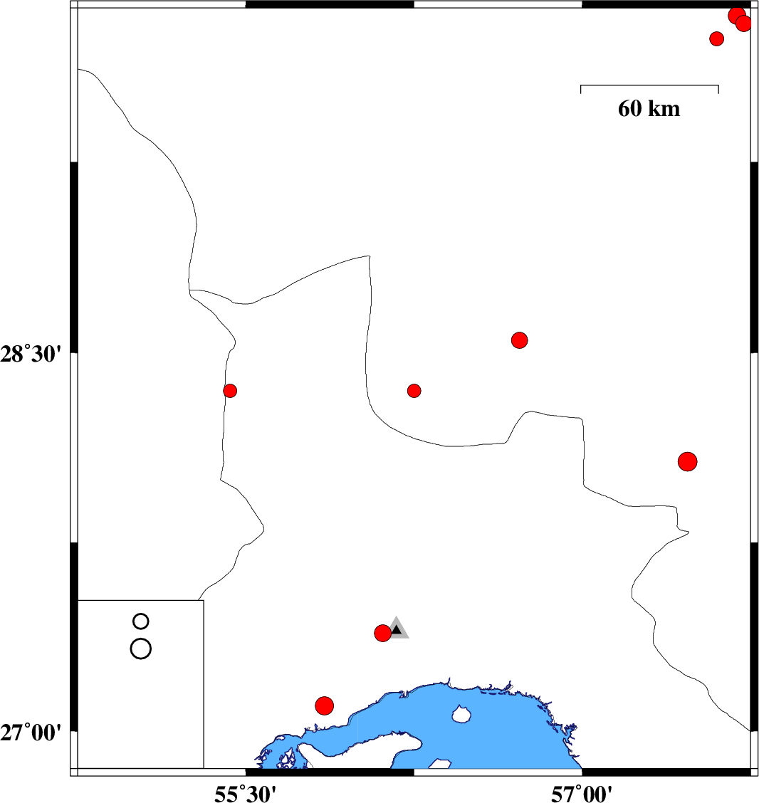 | 2009/05/22 | 10:32:21.4 | 15:02:21.4 | 27.1 | 55.85 | 14 | ML:3.6 | 44 km West of Bandar-e abbas, Hormozgan Province | ||
