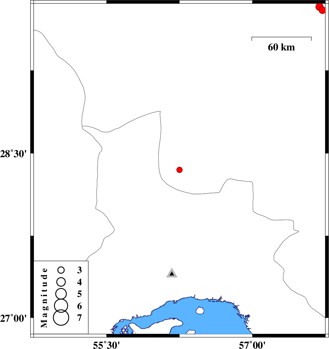 | 2009/06/18 | 04:28:45.8 | 08:58:45.8 | 28.35 | 56.25 | 15 | ML:2.7 | 34 km East of Hajiabad, Hormozgan Province | ||