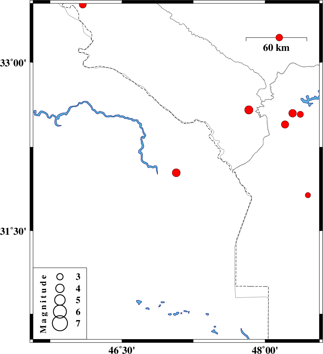| 2009/05/30 | 15:22:18.4 | 19:52:18.4 | 32.54 | 48.37 | 14 | ML:3 | 9 km Andimeshk, Khoozestan Province | ||