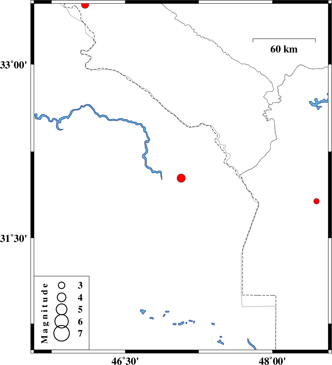 | 2009/06/12 | 09:21:52.3 | 13:51:52.3 | 31.82 | 48.45 | 31 | ML:2.6 | 38 km North-East of Susangerd, Khoozestan Province |