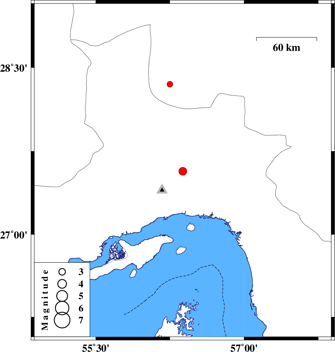 | 2009/06/17 | 09:10:15.5 | 13:40:15.5 | 26.52 | 55.06 | 18 | ML:3.2 | Persian Gulf, 21 km East of Bandar-e lengeh |