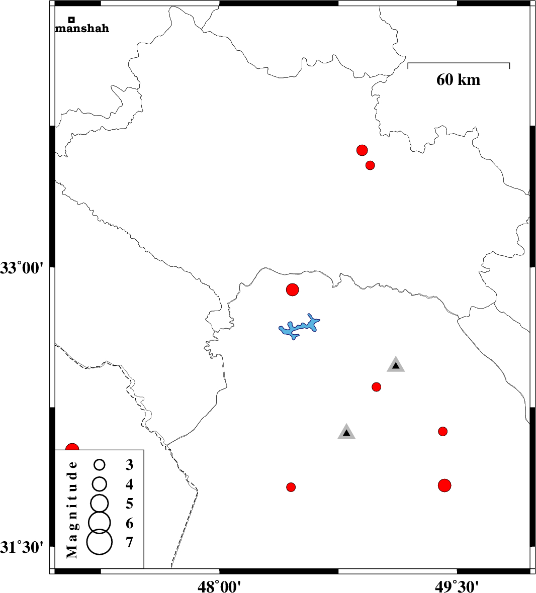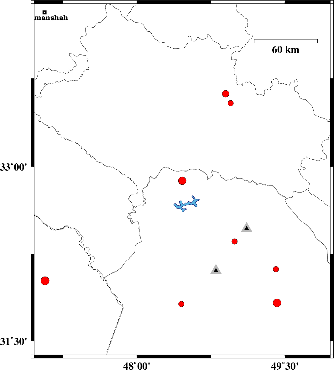 | 2009/06/12 | 04:01:27.8 | 08:31:27.8 | 31.83 | 49.42 | 16 | ML:3.7 | 15 km South-East of Masjed Soleyman, Khoozestan Province |