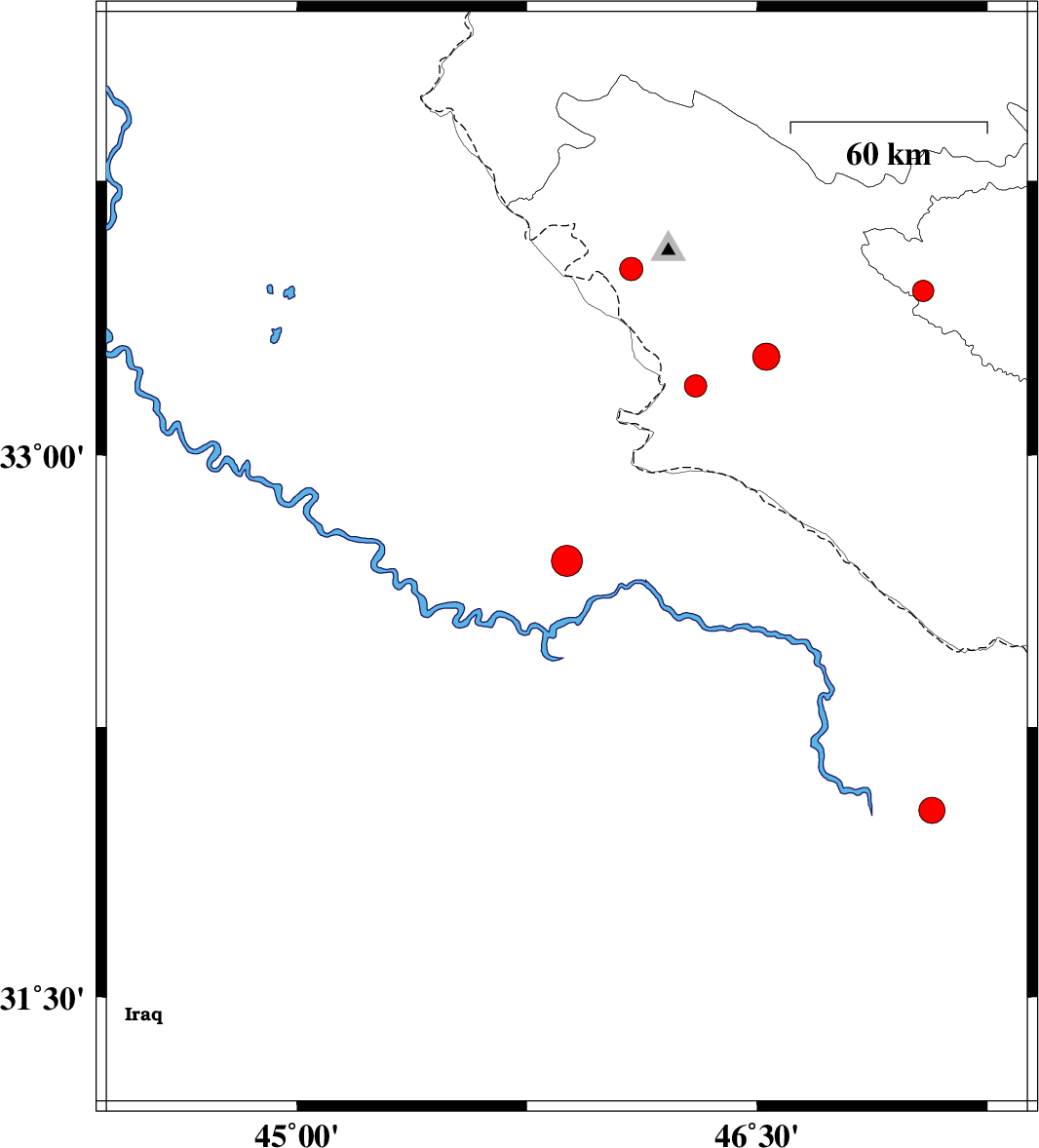 | 2009/06/25 | 15:04:49.0 | 19:34:49.0 | 32.71 | 45.88 | 46 | ML:4.5 | 53 km South-West of Mehran, Ilam Province | ||