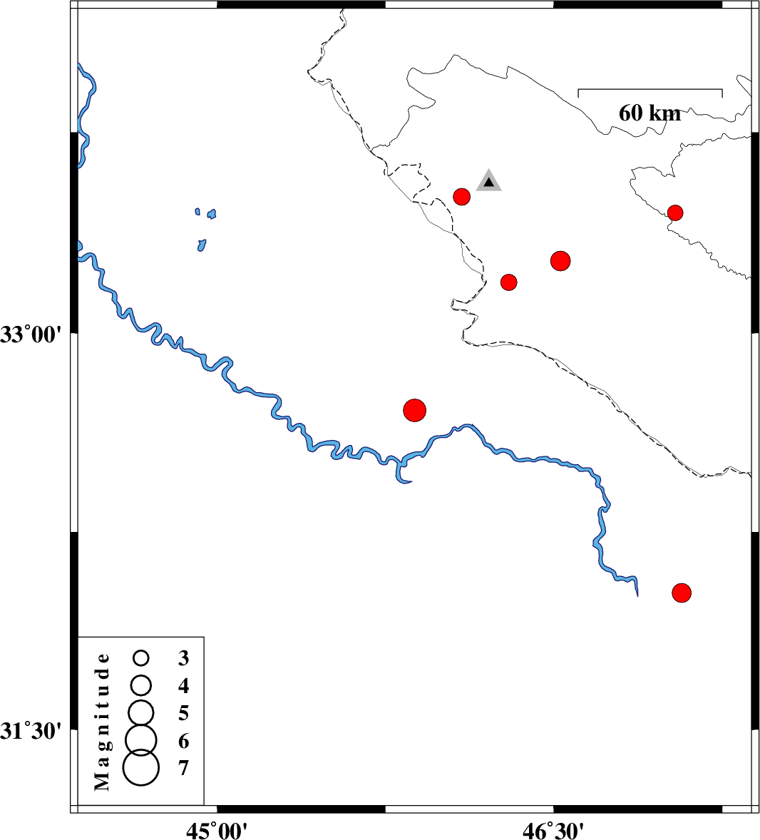 | 2009/06/25 | 17:08:42.9 | 21:38:42.9 | 33.27 | 46.53 | 14 | ML:4 | 37 km North-East of Mehran, Ilam Province | ||