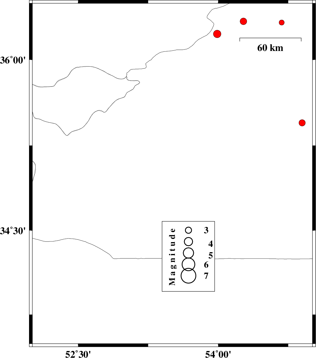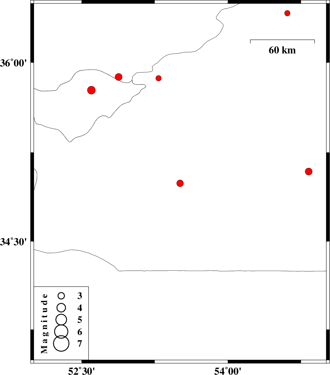 | 2009/06/08 | 00:05:37.2 | 04:35:37.2 | 35.88 | 52.88 | 14 | ML:3.2 | 18 km North-East of Firuzkuh, Tehran Province | ||