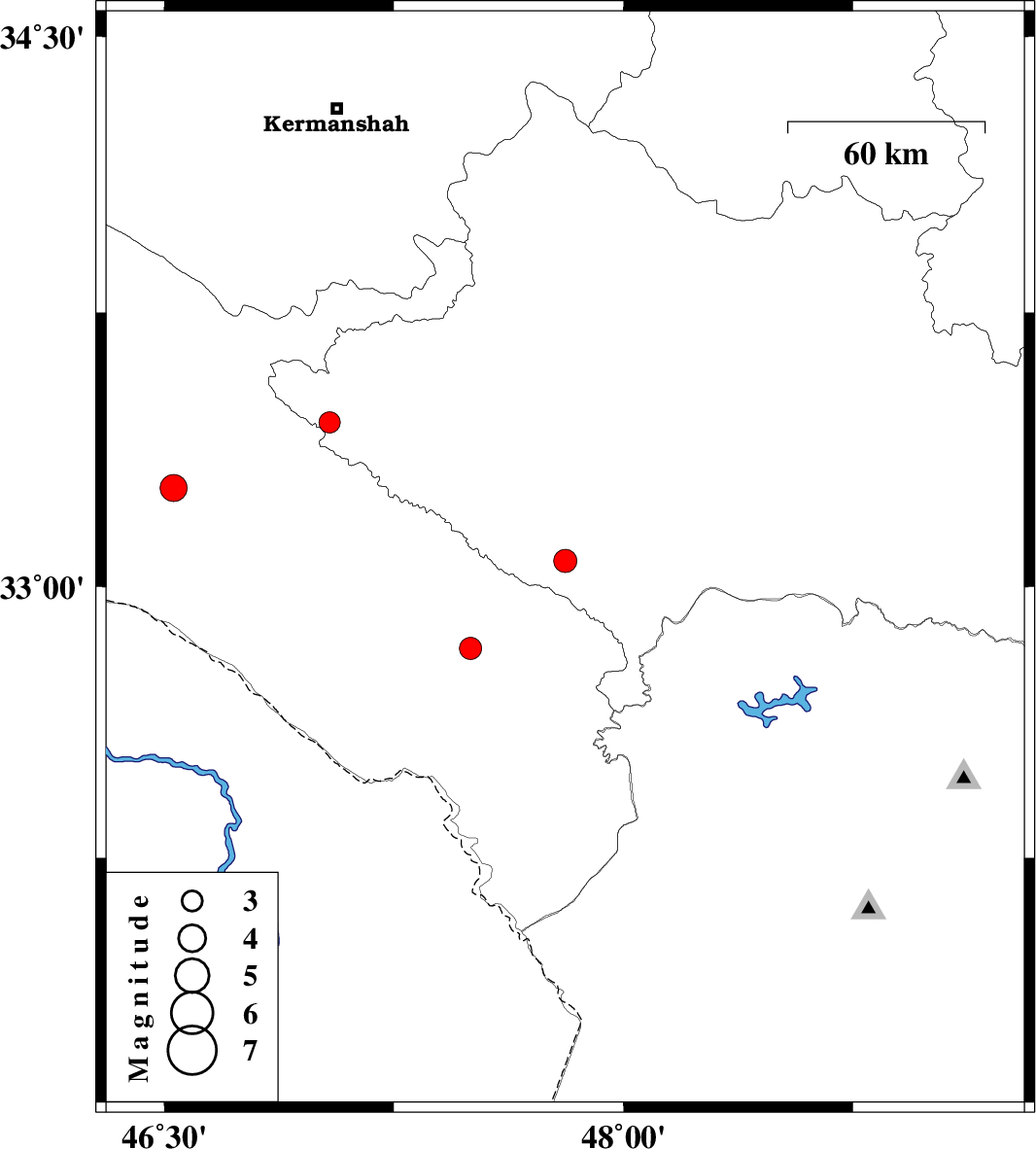 | 2009/06/29 | 08:48:19.1 | 13:18:19.1 | 32.83 | 47.5 | 15 | ML:3.2 | 12 km South of Abdanan, Ilam Province | ||
