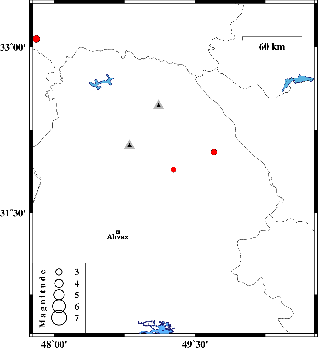| 2009/06/30 | 17:21:37.3 | 21:51:37.3 | 32.05 | 49.7 | 14 | ML:3 | 28 km North-West of Izeh, Khoozestan Province | ||