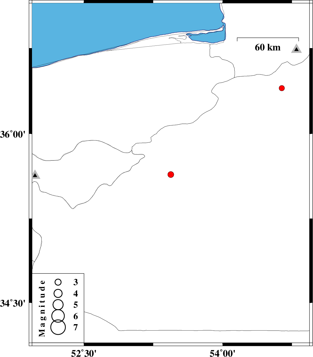 | 2009/12/30 | 15:38:46.8 | 19:08:46.8 | 36.4 | 54.64 | 14 | ML:2.7 | Semnan Province, 30 km West of Shahrud |