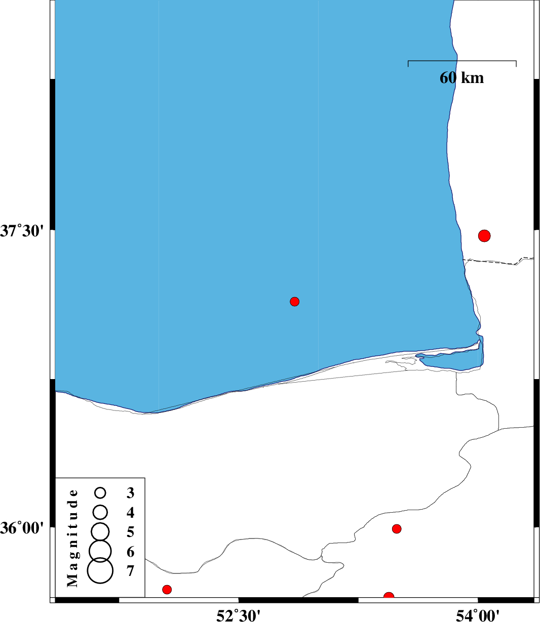 | 2010/01/05 | 12:15:45.4 | 15:45:45.4 | 37.14 | 52.85 | 14 | ML:2.5 | Caspian Sea, 52 km North-East of Babolsar | ||
