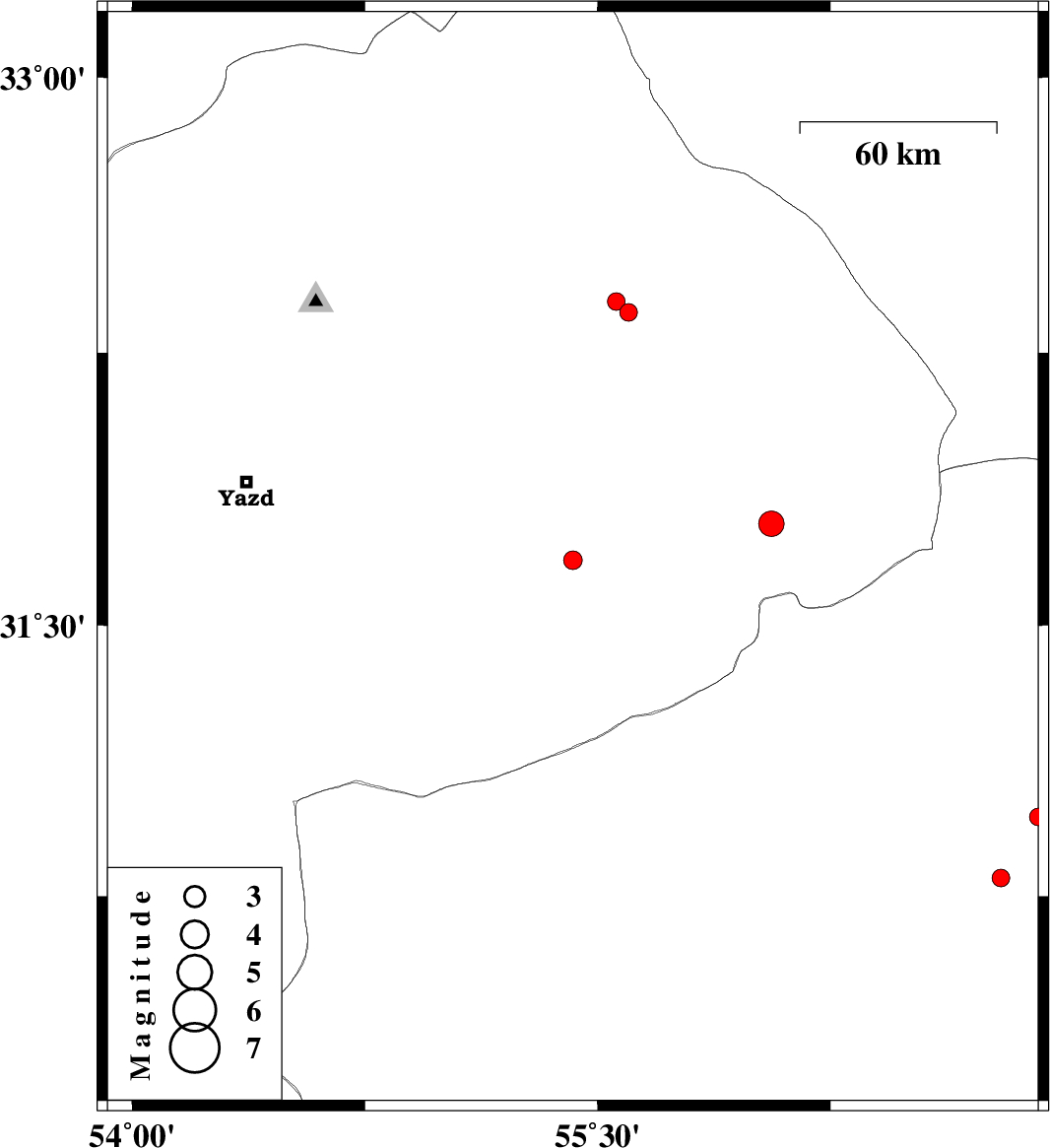 | 2009/12/28 | 09:53:34.5 | 13:23:34.5 | 32.36 | 55.6 | 14 | ML:2.5 | Yazd Province, 86 km North-East of Bafq | ||