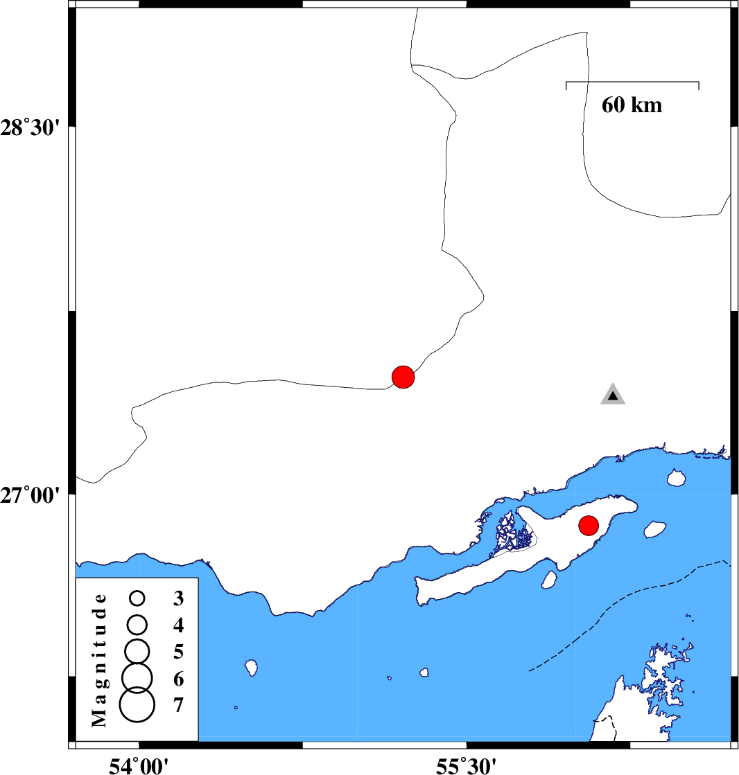 | 2009/12/23 | 16:51:53.2 | 20:21:53.2 | 26.87 | 56.06 | 0 | ML:4.1 | Persian Gulf, 23 km West of Qeshm |