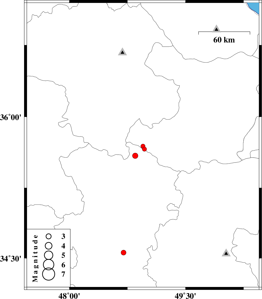 | 2010/01/08 | 00:41:29.0 | 04:11:29.0 | 35.69 | 48.95 | 28 | ML:2.6 | 34 km North of Razan, Hamedan Province | ||
