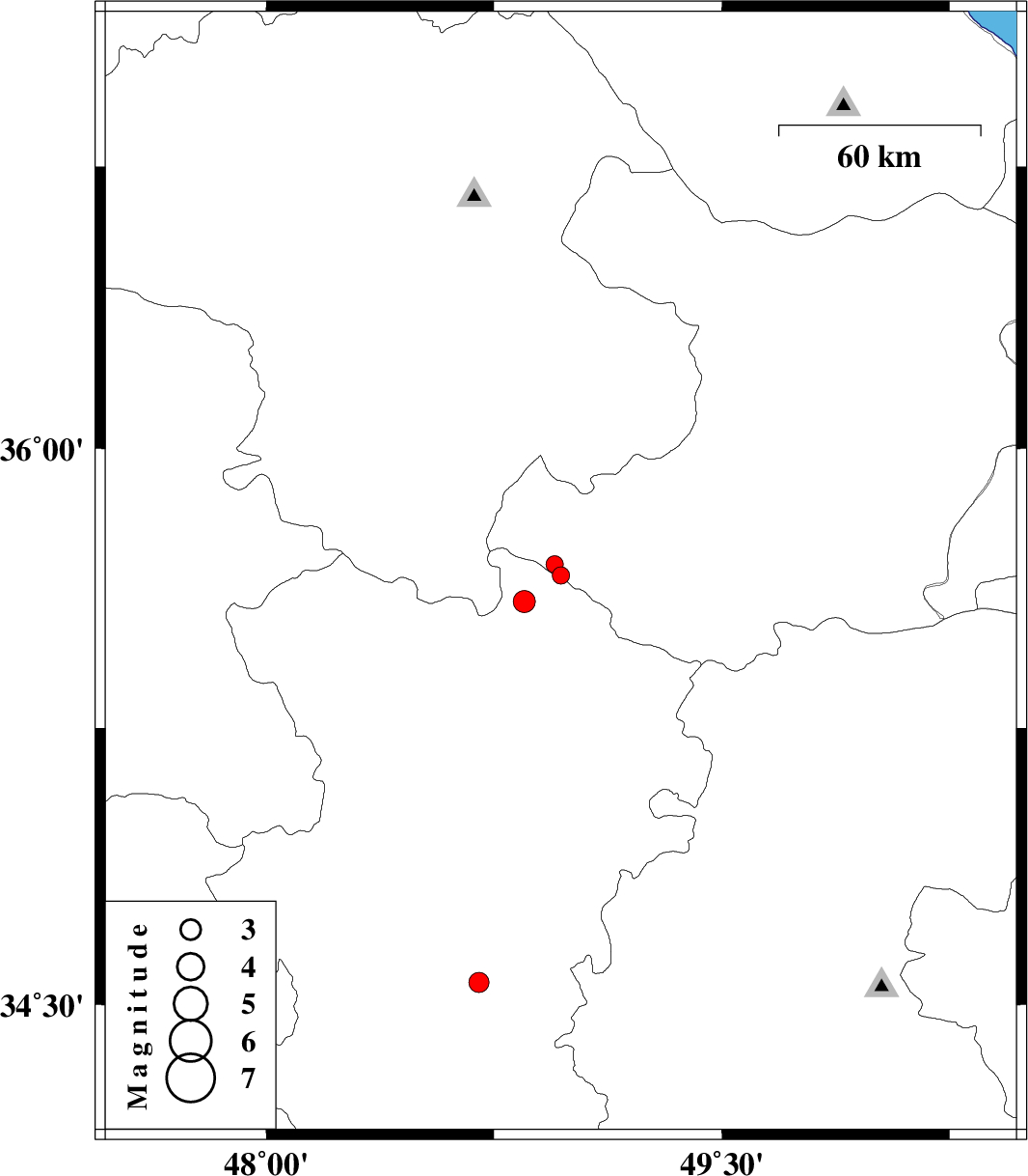 | 2010/01/08 | 00:41:29.0 | 04:11:29.0 | 35.69 | 48.95 | 28 | ML:2.6 | 34 km North of Razan, Hamedan Province | ||