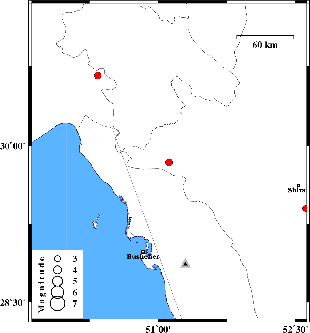 | 2010/01/08 | 02:28:18.5 | 05:58:18.5 | 29.4 | 52.61 | 46 | ML:3 | 25 km South of Shiraz, Fars Province | ||