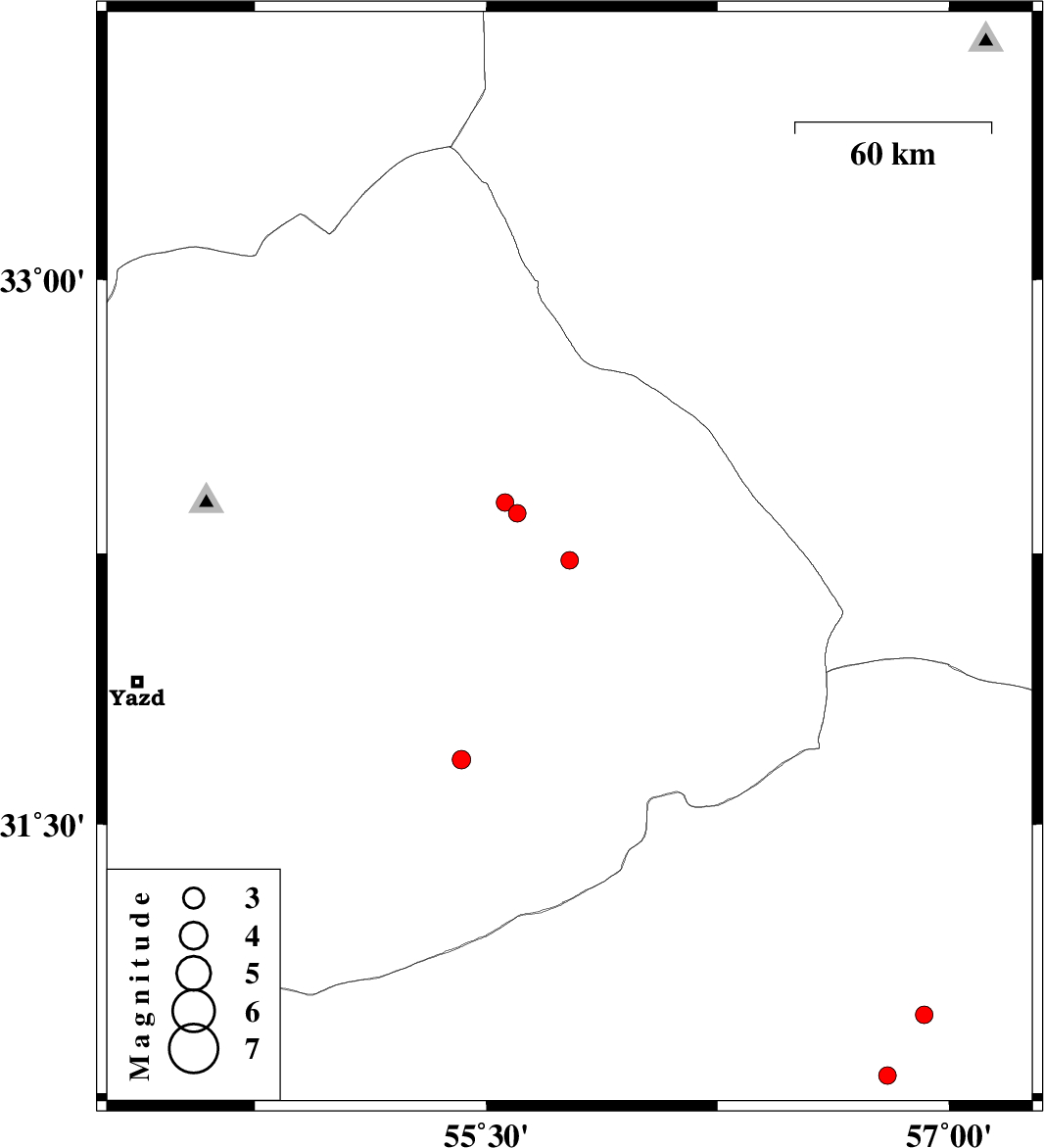 | 2009/12/28 | 09:53:34.5 | 13:23:34.5 | 32.36 | 55.6 | 14 | ML:2.5 | Yazd Province, 86 km North-East of Bafq | ||