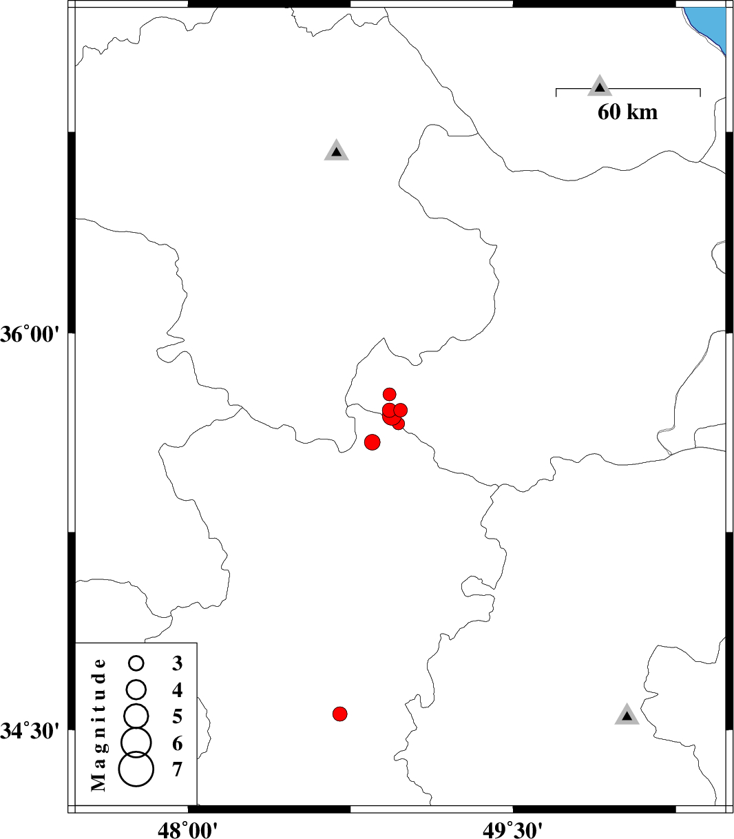| 2010/01/08 | 00:41:29.0 | 04:11:29.0 | 35.69 | 48.95 | 28 | ML:2.6 | 34 km North of Razan, Hamedan Province | ||