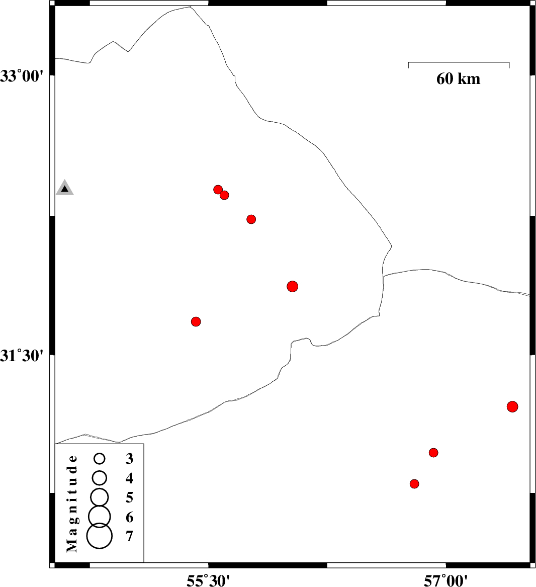 | 2010/01/11 | 00:16:52.2 | 03:46:52.2 | 31.87 | 56.03 | 14 | ML:3.1 | 66 km North-East of Bafq, Yazd Province | ||