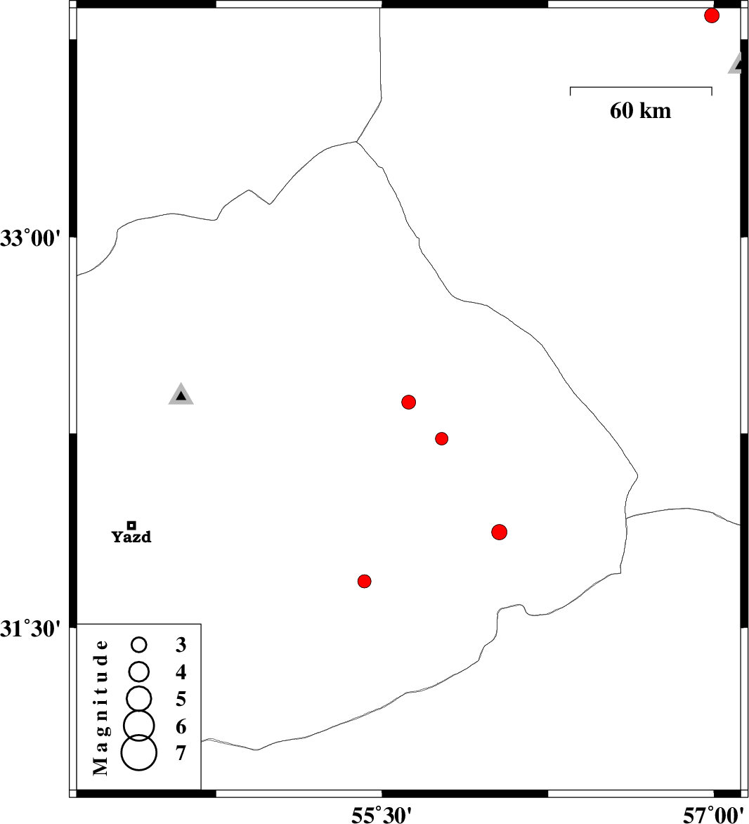 | 2010/01/11 | 00:16:52.2 | 03:46:52.2 | 31.87 | 56.03 | 14 | ML:3.1 | 66 km North-East of Bafq, Yazd Province | ||