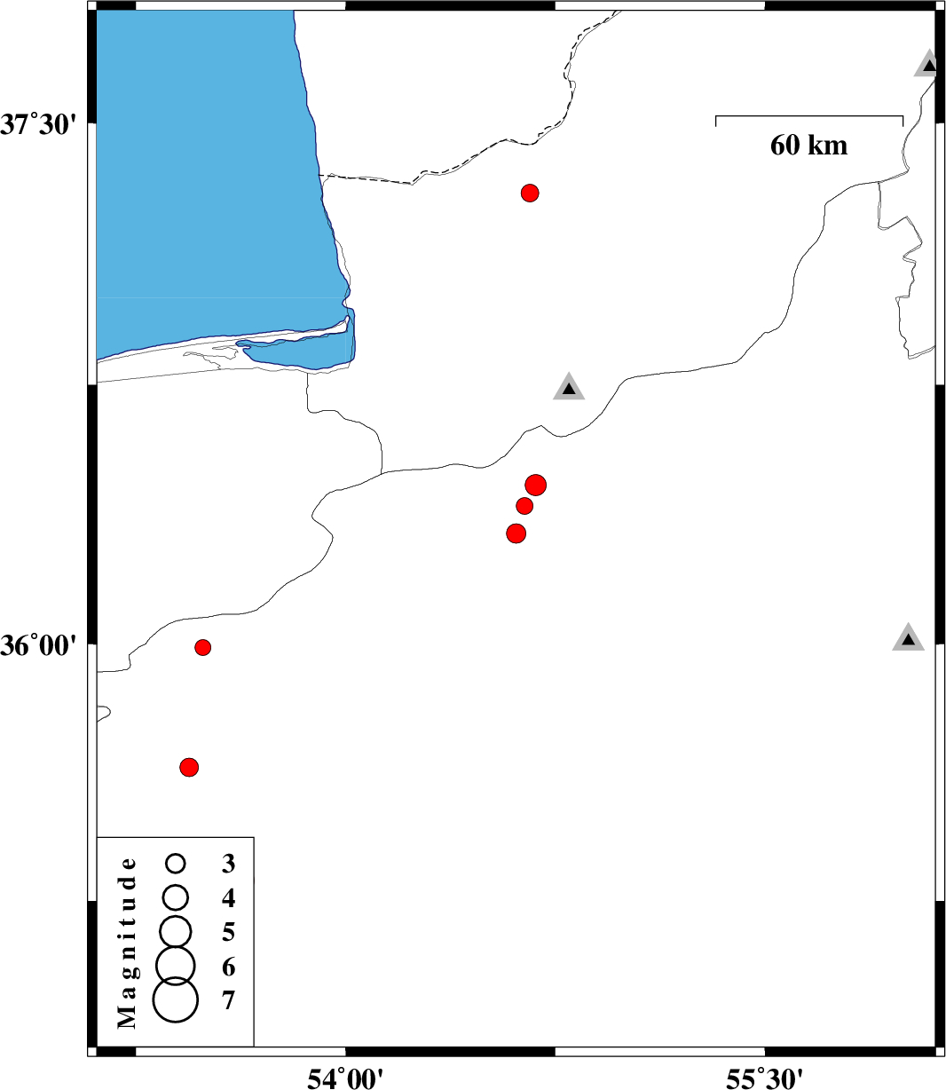 | 2010/01/03 | 16:39:52.9 | 20:09:52.9 | 37.3 | 54.66 | 14 | ML:2.8 | 36 km North-East of Aq Qaleh, Golestan Province | ||