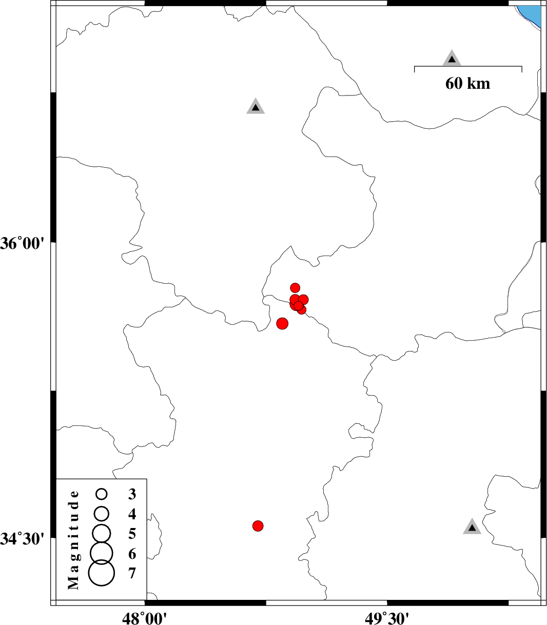 | 2010/01/08 | 00:41:29.0 | 04:11:29.0 | 35.69 | 48.95 | 28 | ML:2.6 | 34 km North of Razan, Hamedan Province | ||