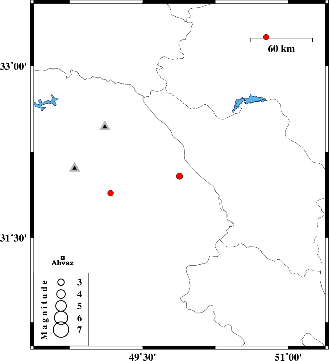 | 2010/01/11 | 01:08:17.0 | 04:38:17.0 | 31.89 | 49.17 | 27 | ML:2.7 | 13 km West of Masjed Soleyman, Khoozestan Province |