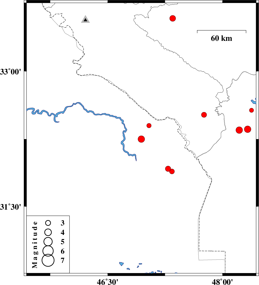 | 2009/12/31 | 04:27:41.9 | 07:57:41.9 | 31.89 | 47.34 | 37 | ML:3 | Iraq, 90 km South of Dehloran | ||