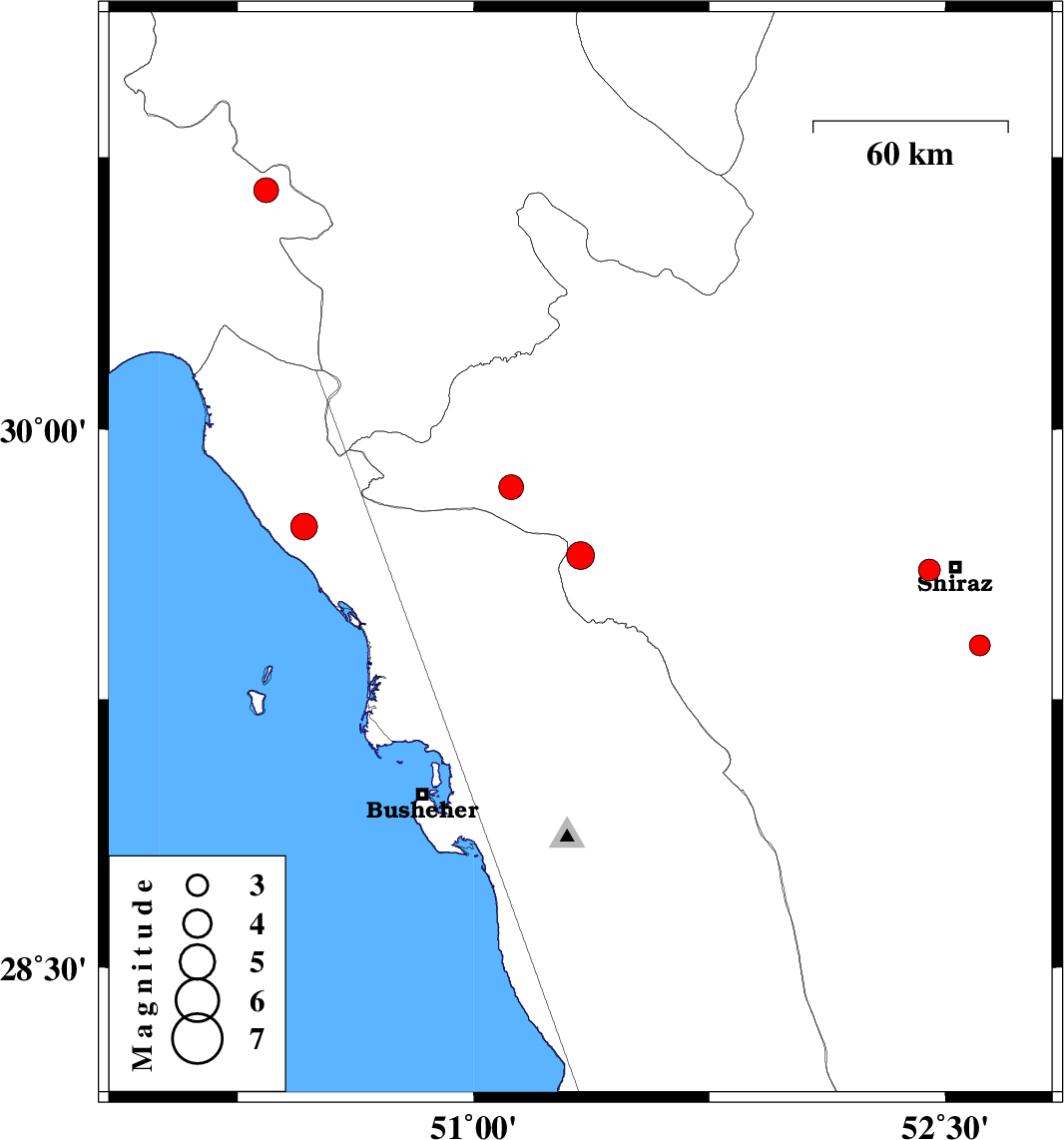 | 2010/01/14 | 00:52:00.5 | 04:22:00.5 | 29.73 | 50.46 | 28 | ML:3.8 | 18 km North of Bandar-e genaveh, Bushehr Province | ||