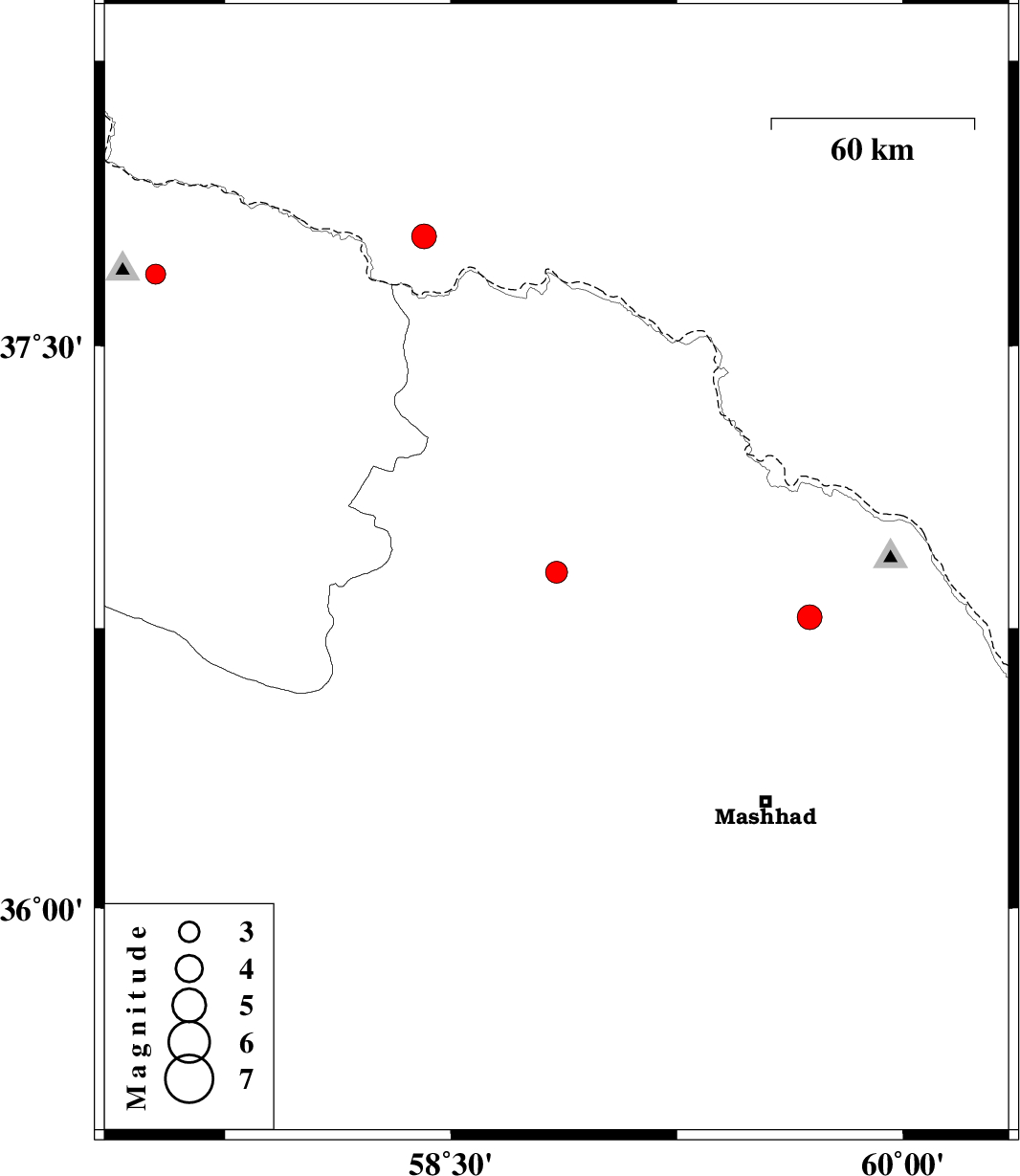 | 2010/01/02 | 22:13:11.0 | 01:43:11.0 | 36.78 | 59.69 | 34 | ML:3.7 | 52 km North-East of Chenaran, Khorasan(center) Province | ||