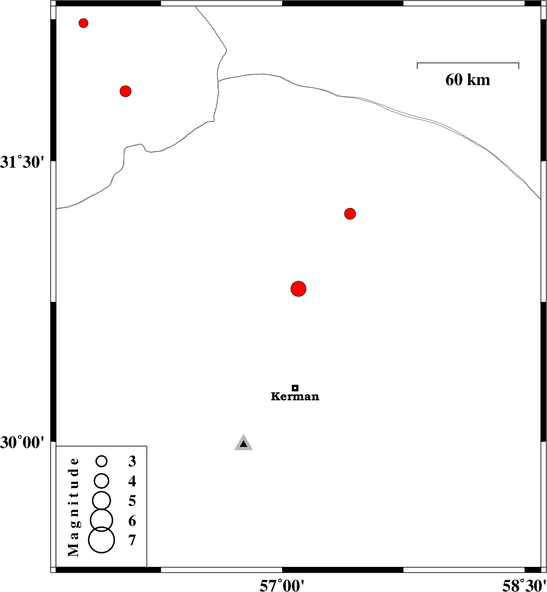 | 2009/12/27 | 11:01:47.2 | 14:31:47.2 | 31.22 | 57.42 | 14 | ML:3.1 | Kerman Province, 58 km East of Ravar |