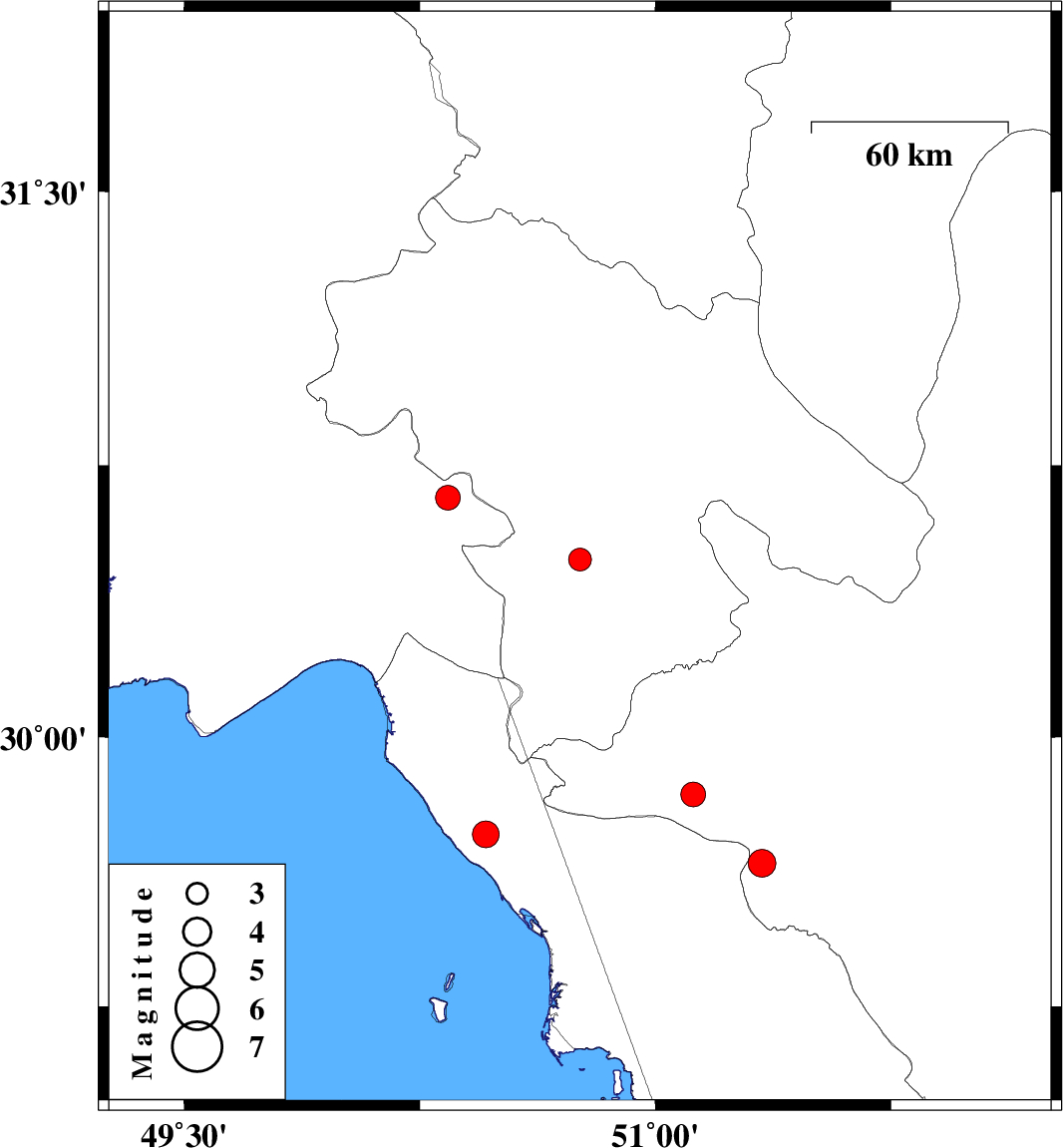 | 2010/01/14 | 00:52:00.5 | 04:22:00.5 | 29.73 | 50.46 | 28 | ML:3.8 | 18 km North of Bandar-e genaveh, Bushehr Province | ||