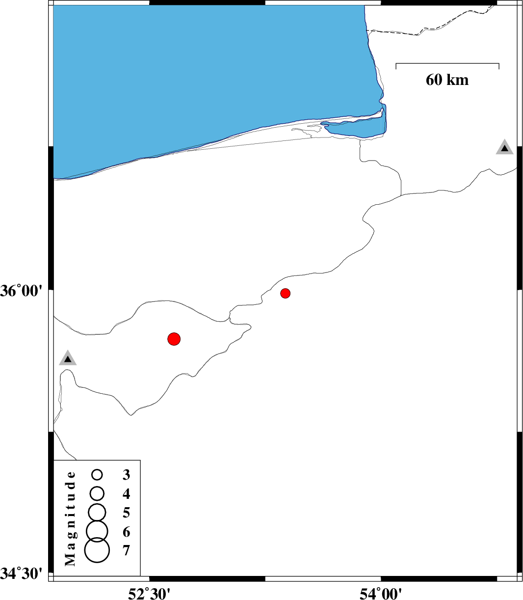 | 2010/01/30 | 10:25:43.6 | 13:55:43.6 | 35.98 | 53.38 | 39 | ML:2.8 | 32 km South-East of Pol-E-Sefid, Mazandaran Province | ||