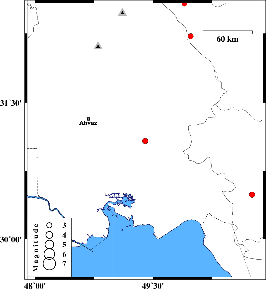 | 2010/01/30 | 11:56:46.3 | 15:26:46.3 | 31.08 | 49.4 | 37 | ML:3.3 | 29 km South-West of Ramhormoz, Khoozestan Province | ||