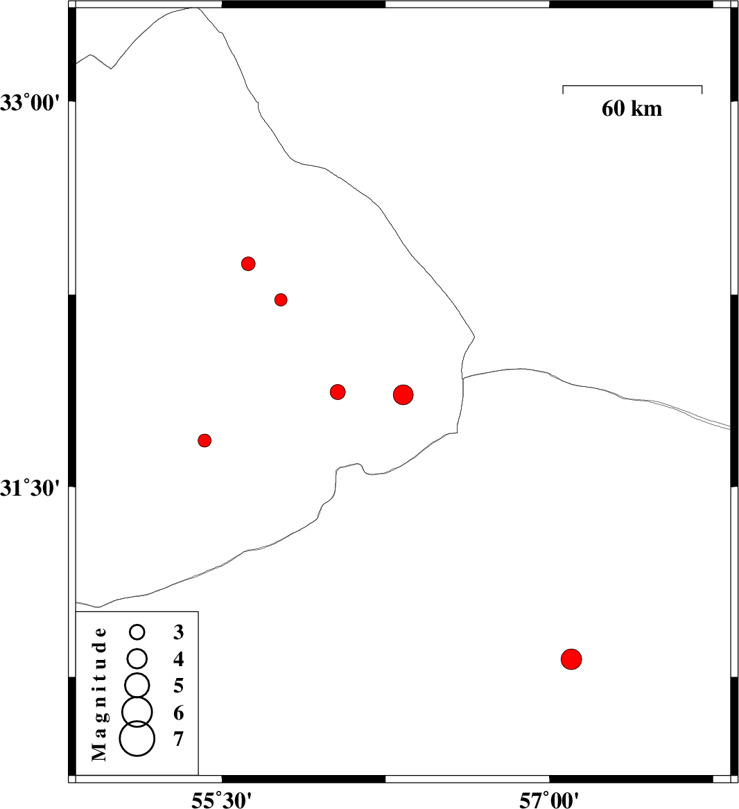 | 2010/01/11 | 00:16:52.2 | 03:46:52.2 | 31.87 | 56.03 | 14 | ML:3.1 | 66 km North-East of Bafq, Yazd Province | ||