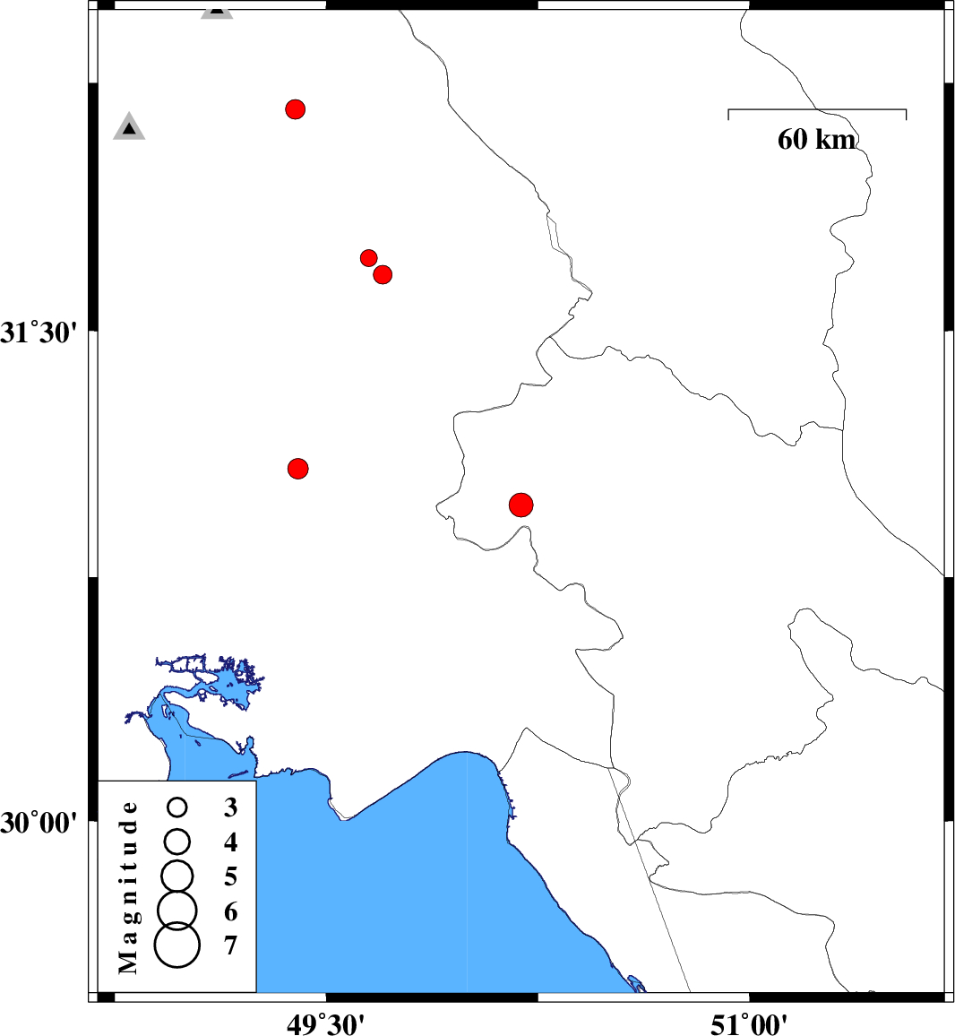 | 2010/01/30 | 11:56:46.3 | 15:26:46.3 | 31.08 | 49.4 | 37 | ML:3.3 | 29 km South-West of Ramhormoz, Khoozestan Province |