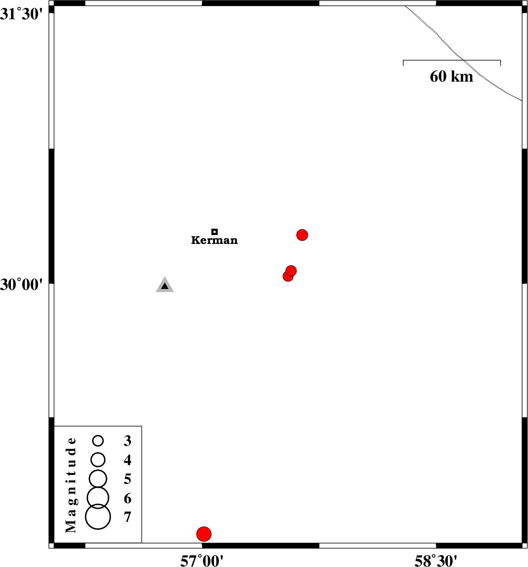 | 2010/02/07 | 08:15:03.3 | 11:45:03.3 | 30.07 | 57.57 | 6 | ML:3.1 | 53 km South-East of Kerman, Kerman Province | ||