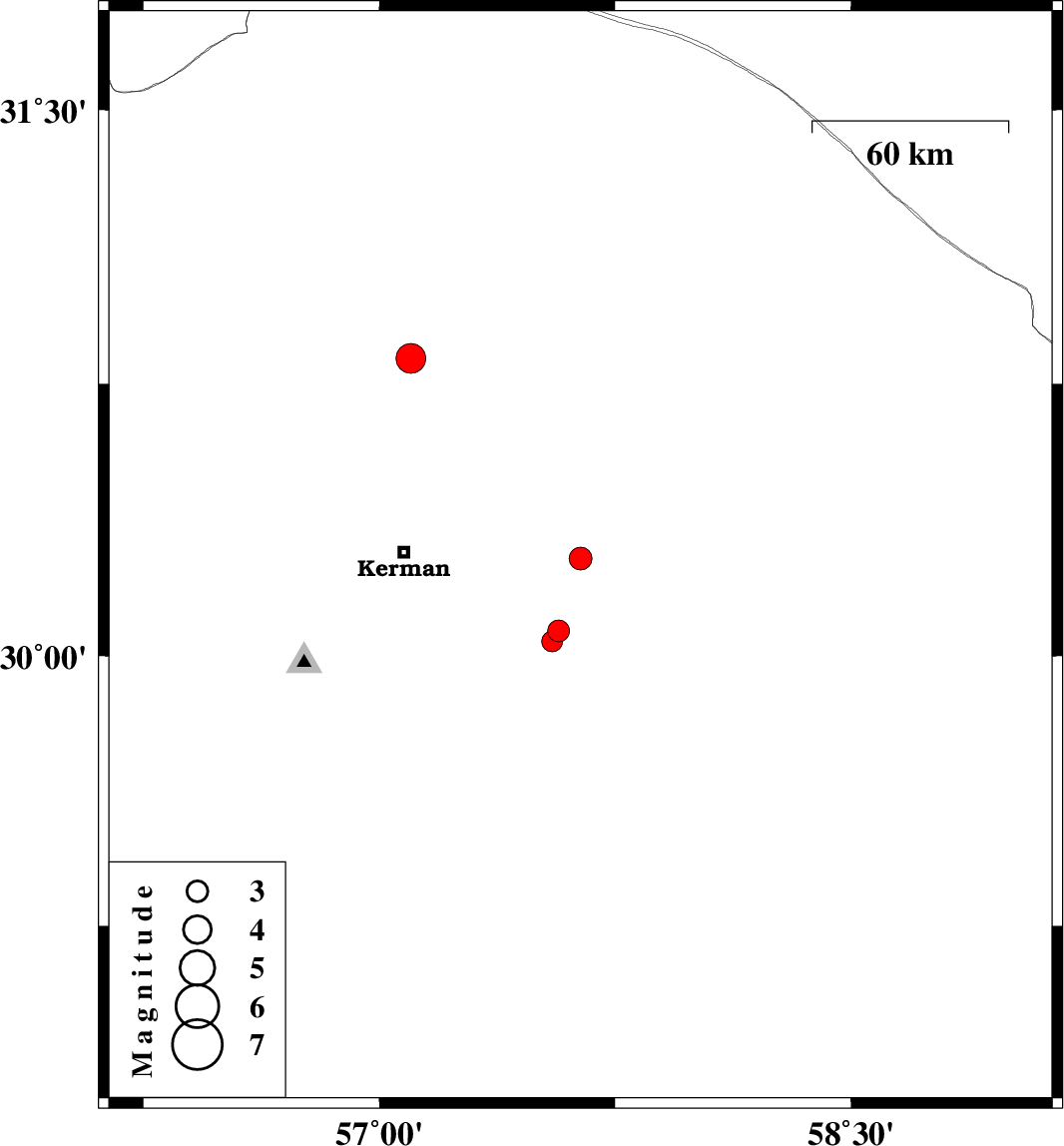| 2010/02/07 | 08:15:03.3 | 11:45:03.3 | 30.07 | 57.57 | 6 | ML:3.1 | 53 km South-East of Kerman, Kerman Province | ||